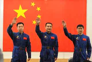 9月24日,神舟七號載人航天飛行任務航天員乘組與記者見面。