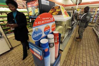 20日,在美國首都華盛頓國會山,印有美國民主黨總統候選人奧巴馬和共和黨總統候選人麥凱恩名字的一次性紙杯被擺放在一家7-11便利店里。顧客可以根據自己的傾向選擇其一盛取咖啡。當天,印有奧巴馬名字的紙杯在這場全國范圍內舉行的“咖啡杯競賽”中以60%的“支持率”居領先地位。