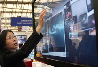 11月12日,參展商工作人員在展示多點觸摸式多媒體觸摸顯示屏產品。當日,第72屆中國電子展在上海新國際博覽中心開幕。