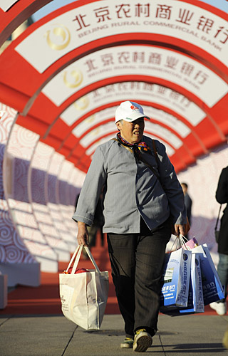 11月13日,一位觀眾提著資料走出北京展覽館。當(dāng)日,第四屆北京國際金融博覽會在北京展覽館開幕,本屆博覽會會聚國內(nèi)百余家銀行、基金、證券、保險等金融機構(gòu),近千種金融理財產(chǎn)品在博覽會上集中展示。