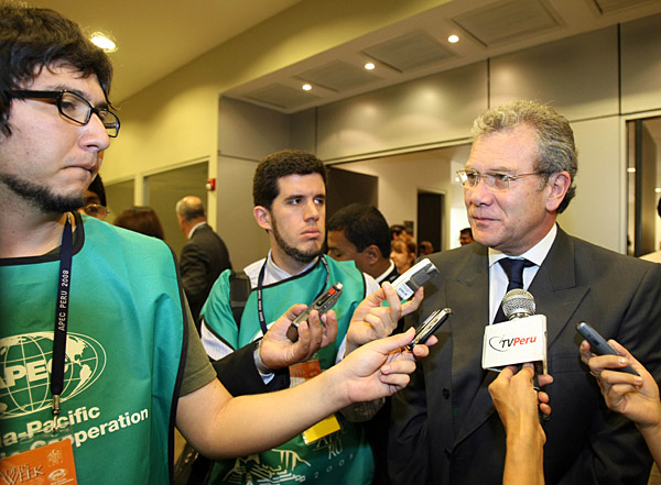 | 16日,在秘魯首都利馬,秘魯外交部副部長(zhǎng)岡薩洛·古鐵雷斯(右)在亞太經(jīng)合組織(APEC)高官會(huì)議召開前接受采訪。當(dāng)天,APEC21個(gè)成員的高官齊聚秘魯國(guó)家博物館,就世界經(jīng)濟(jì)和金融形勢(shì)、支持世界貿(mào)易組織多哈回合談判、亞太地區(qū)經(jīng)濟(jì)一體化等議題交換意見。高官會(huì)議的召開標(biāo)志著本屆APEC領(lǐng)導(dǎo)人會(huì)議周正式拉開帷幕。 | |