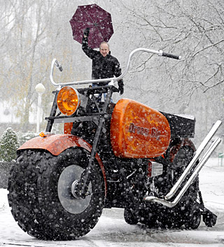 24日,來自美國的格雷戈里·鄧納姆在德國埃森汽車展媒體日上展示他的巨型摩托車。這輛摩托車長達6.20米,重為500磅(約合227公斤),已被載入吉尼斯世界紀錄。新華社/法新