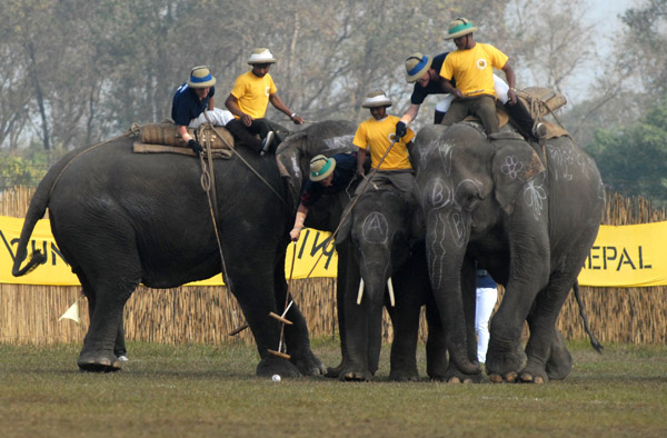 3日,在距尼泊爾首都加德滿都250公里的奇特旺地區舉行的國際象球錦標賽上,雙方隊員在場上爭搶。象球與普通的馬球相似,但是場地小一些,每方出4名參賽者進行兩回合各10分鐘的比賽。騎在大象背上的球員揮動長桿擊球。如果大象用它的鼻子拾起球則會被判犯規。新華社/法新