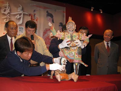 “絲路傳奇——新疆文物大展”12月3日在臺(tái)灣歷史博物館舉行開箱儀式。據(jù)主辦方介紹,所有參展文物準(zhǔn)備就緒后,將于12月6日正式和臺(tái)灣民眾見(jiàn)面,持續(xù)展出3個(gè)多月。 圖為兩岸文物專家和協(xié)辦單位代表一起,為木雕天王踏鬼俑開箱。