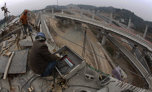 1月2日,工人在宜萬鐵路火光村特大橋群工地施工。