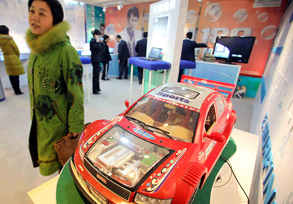 1月5日,一名參觀者在汽車信息化展區參觀。