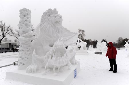 1月13日,一名工作人員站在獲得二等獎的作品《勇氣》旁。當日,第25屆中國·哈爾濱國際冰雪節的重頭戲——第14屆哈爾濱國際雪雕比賽在歷時四天后落下帷幕。俄羅斯哈巴羅夫斯克隊的作品《生日快樂》獲得一等獎;中國隊的作品《勇氣》和俄羅斯維亞澤姆斯基隊的作品《快閃》獲得二等獎。