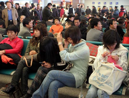 滯留旅客在成都雙流國際機場候機廳內等待。