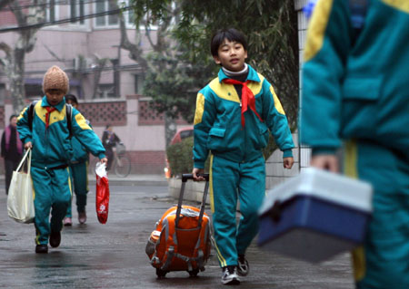 2月9日,上海市徐匯區高安路第一小學的學生們走在上學路上。 當日,上海市160萬名中小學生正式開學。上海市各區縣教育局向社會作出新學期“減負”承諾:作業量“做減法”,課外活動時間“做加法”;教師若“減負”不力,可能被調離工作崗位。同時公布的一系列“減負”具體措施包括:不讓教輔材料進課堂,低年級學生無書面家庭作業,每周五設為學生創新實踐日,布置給學生的作業教師必須先做一遍等。