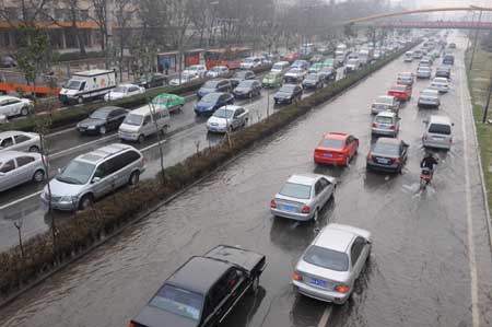 2月18日晨,由于自來(lái)水主管道輸水聯(lián)絡(luò)線爆裂,陜西省西安市南二環(huán)長(zhǎng)安大學(xué)路段汪洋一片,造成交通擁堵。自來(lái)水公司管網(wǎng)搶修人員快速趕到現(xiàn)場(chǎng)進(jìn)行搶修,該路段交通于上午9時(shí)左右恢復(fù)正常。圖為車(chē)輛在西安市南二環(huán)長(zhǎng)安大學(xué)附近路段涉水前行。