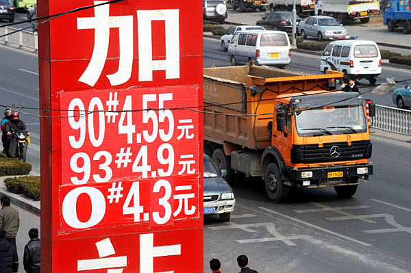 海爾路一加油站張貼出降價(jià)后的新價(jià)格吸引顧客(3月3日攝)。