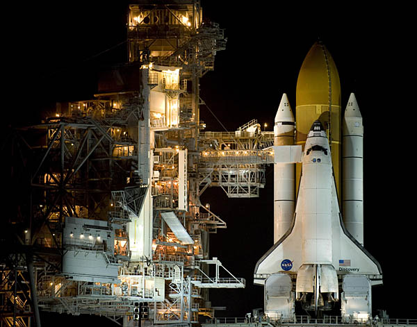 14日,在美國佛羅里達州的肯尼迪航天中心,“發現”號航天飛機豎立在發射架上。美國國家航空航天局目前擬定于美國東部時間15日19時43分(北京時間16日7時43分)發射“發現”號航天飛機。新華社/法新
