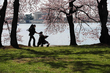 3月31日,游人在美國首都華盛頓蓄潮湖邊欣賞櫻花。今年的華盛頓櫻花節于3月28日至4月12日間舉行,預計將于4月1日至4日迎來櫻花盛開高峰。