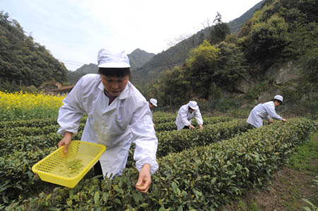 4月2日,茶廠工人正在采摘新茶。浙江省建德市農業、質監等相關部門近幾年大力發展當地傳統的“建德苞茶”,引導茶農規模化種植并推進茶文化品牌建設,使該茶獲得“中國文化名茶”稱號,為當地農村經濟發展和農民增收起到了促進作用。