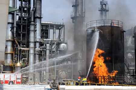 這是消防官兵正在奮力撲救(4月8日攝)。4月8日凌晨4時30分許,內蒙古伊泰集團煤間接液化項目基地1號、2號輕質油儲油罐發生火災事故,火災未造成人員傷亡和關鍵生產設備的損毀。截至當日16時10分,明火已被全部撲滅,火勢得到有效控制。