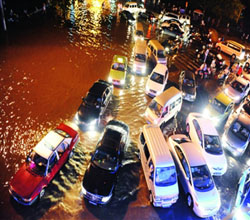 圖為6月27日晚,鄭州市文化路北段的積水造成車輛行駛緩慢。 近日,我國多個地方遭受暴雨襲擊。27日19時起,河南省鄭州市遭遇強風暴雨和雷電襲擊,市區部分道路積水嚴重,造成交通堵塞。28日凌晨,江蘇省徐州市豐縣發生雷雨大風災害,造成4人死亡。27日以來,重慶一些區縣遭遇暴雨襲擊,目前已造成萬州、開縣、大足等7個區縣38個鄉鎮受災,受災人口19.65萬人,失蹤1人。新華社發