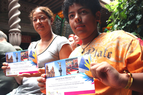 28日,在墨西哥首都墨西哥城,游客展示醫療便利卡。當日,墨西哥城市政府向第一批10名游客發放醫療便利卡,旨在吸引更多國內外游客。持此卡的游客可以享受流感的預防和治療,突發事故緊急救援,急診及送藥服務等,游客只需支付少量費用。 新華社發