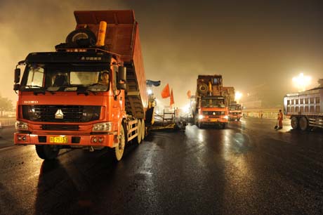 為迎接國慶60周年大閱兵,北京長安街開始大修。據北京市政路橋建材公司總經理劉振成介紹,此次鋪上路面的瀝青是中國石化“東海”瀝青,其低溫抗裂、防滑、減噪和抗車轍性能等方面均達到了國際領先水準,攤鋪后道路使用壽命可以延長至15年左右。圖為天安門城樓東側的長安街上,十幾臺道路瀝青攤鋪機正在夜色下緊張作業。