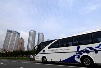 在大連舉行的夏季達沃斯年會是一屆“綠色達沃斯年會”,年會的公務用車中有257臺節(jié)能與新能源汽車,占會議公務用車的一半以上。圖為一輛為夏季達沃斯年會服務的純電動汽車。新華社記者
