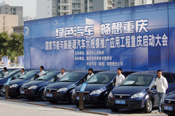 2008年11月27日,重慶市政府向長安汽車集團采購的首批混合動力政府公務用車正式交付使用。新華社記者 劉潺
