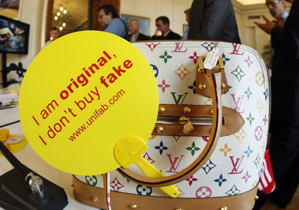 28日,在法國東南部城市戛納舉行的一個打擊假冒產品宣傳活動中,仿冒名牌女包旁陳列著寫有反假冒產品標語的標牌。當天,這里的海關人員在打假活動中銷毀了今年夏天繳獲的2萬多件仿冒產品。