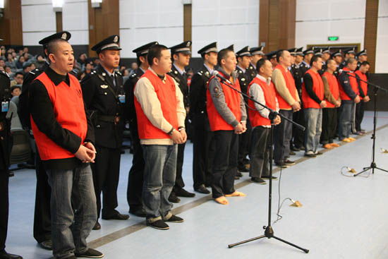 10月12日,楊天慶(左一)等被告人在庭審現場。 當日,重慶兩起“涉黑涉惡”案件分別在重慶市第一和第三中級人民法院開庭,31名被告人受審。其中重慶市第一中級人民法院公開開庭審理的是楊天慶等9人“涉黑”案,國家公訴機關指控的涉案罪名多達十項,涉嫌犯罪時間跨越八年。從當日起,重慶的“涉黑涉惡”案件將在五個中級法院陸續開庭審理。新華社發