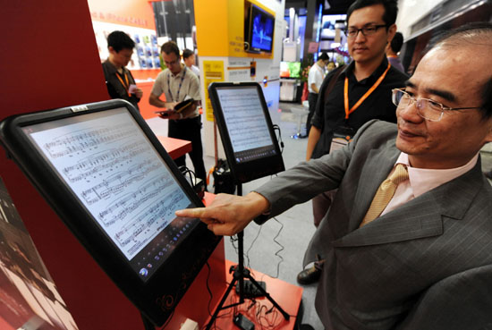 13日,全球最大規模的電子產品貿易展覽——第29屆香港秋季電子產品展在香港會議展覽中心開幕,展覽為期四天。本屆展覽共展出2852家參展商的最新電子產品。圖為參觀者正在一展覽會展臺前親手體驗電子樂譜。