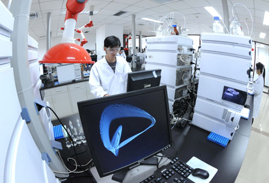 10月18日,凱萊英(天津)有限公司的科技人員在進行生物醫藥技術研發。據介紹,天津濱海新區加快發展現代生物醫藥產業,重點規劃了10平方公里的京津冀生物醫藥產業化示范區,預計在5年內形成500億元的產業規模。同時,還籌備設立了50億元“生物醫藥產業發展基金”,支持生物醫藥企業發展。目前,濱海新區已聚集了包括大型生物醫藥制造企業、傳統中醫藥生產企業、生物醫藥孵化器和醫療器械企業在內的100多家企業,產業規模近100億元,年均增長率接近40%。