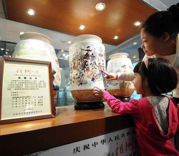 《瓷都傳人—— 2009當代景德鎮陶瓷藝術作品展》日前在京展出。近千件現代陶瓷藝術精品匯集北京王府井陶瓷城,由中國工藝美術大師秦錫麟、王錫良、戴榮華、王恩懷為慶祝新中國成立60周年,聯袂設計、創作的紀念瓷《祖國頌》在本次展覽中展出,引起首都收藏界和陶瓷文化界人士的矚目。 圖為觀眾在北京王府井陶瓷城參觀由四位中國工藝美術大師創作的紀念瓷《祖國頌》。