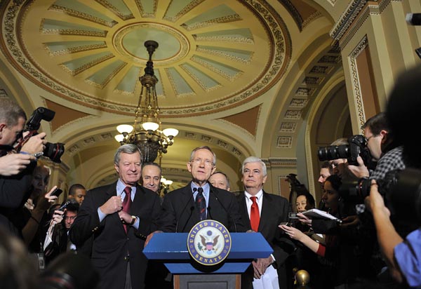 12月24日,美國國會參議員多數黨領袖、民主黨參議員哈里·里德(中)在投票后出席記者會。美國國會參議院24日清晨投票通過了美國總統奧巴馬支持的全面醫療改革法案。法案的核心是創建一個聯邦監管的醫療保險市場,而政府將成立公共保險機構出售醫療保險。 新華社記者張巖攝(詳細報道見四版)