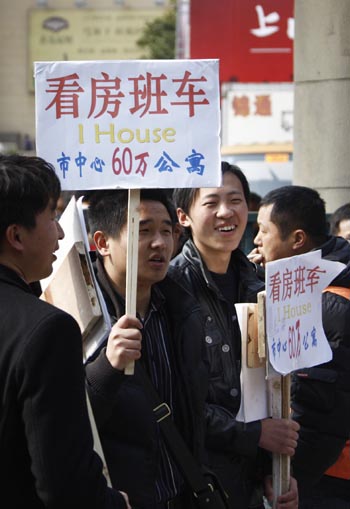 3月18日,參展房地產企業的工作人員在廣場上招攬看房者。 當日,有“上海樓市風向標”之稱的“2010上海之春房產展示交易會”在上海展覽中心開幕。此次參展的國內開發商約200家,展覽面積達2萬平方米。在2009年底以來推出的密集調控政策影響下,本屆展會首日盡管人氣不減,但市場的觀望氣氛也悄然升溫。