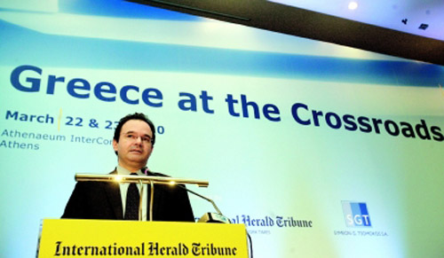 3月23日,希臘財政部長喬治·帕帕康斯坦季努在雅典舉行的“希臘在十字路口上”經濟研討會上發言。帕帕康斯坦季努表示,希臘尋求并期待25日的歐盟首腦會議出臺針對希臘債務危機的救助方案,但這絕非乞求。新華社發