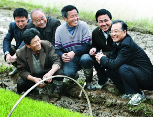 4月9日至11日,中共中央政治局常委、國務院總理溫家寶來到安徽蚌埠、池州兩地,深入田間地頭察看苗情,走村入戶看望群眾,實地考察農(nóng)產(chǎn)品加工龍頭企業(yè)和治淮工程現(xiàn)場,召開座談會聽取基層干部群眾的建議。 這是4月10日,溫家寶在池州市貴池區(qū)梅龍鎮(zhèn)和當?shù)剞r(nóng)民一起察看早稻育秧情況。