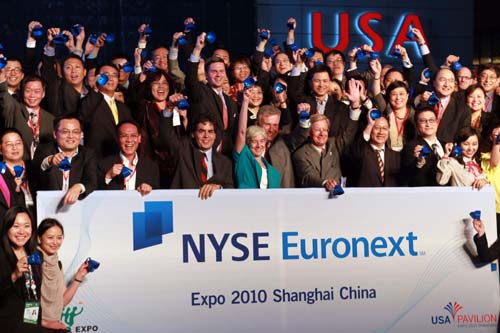 5月20日北京時間21點30分(美國東部時間上午9點30分),美國紐約泛歐交易所集團高管與紐約證券交易所部分上市公司代表在上海世博園美國館前搖響小鐘,為紐約證券交易所遠程開市。當日,美國紐約證券交易所在上海世博園美國館和位于紐約的交易所交易大廳內同步舉行開市儀式!