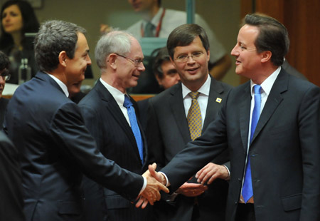 6月17日,在比利時首都布魯塞爾,(從左至右)歐盟輪值主席國西班牙首相薩帕特羅、歐洲理事會常任主席范龍佩、荷蘭首相巴爾克嫩德歡迎首次參加歐盟首腦會議的英國首相卡梅倫。 歐盟成員國領導人17日在布魯塞爾召開會議,重點討論歐盟未來10年經濟發展戰略和加強歐盟經濟治理,試圖著眼長遠避免債務危機重演。