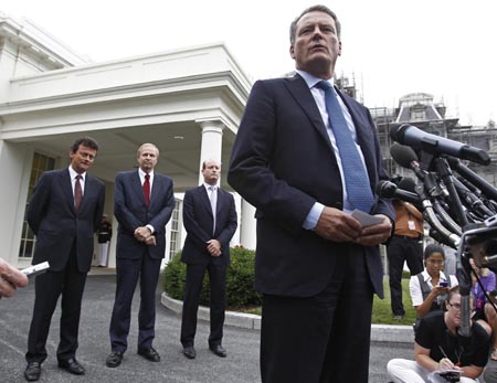 6月16日,在美國首都華盛頓白宮,英國石油公司董事會主席卡爾-亨里克·斯萬貝里(前)與美國總統奧巴馬會見后對媒體講話。 斯萬貝里當天宣布,該公司將不再發放今年頭三個季度的股息。同時他還確認,英國石油公司已經同意拿出200億美元建立墨西哥灣石油泄漏事件賠償基金。