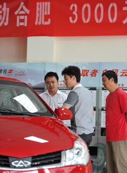 隨著首批“節能產品惠民工程”節能汽車(1.6升及以下乘用車)推廣目錄公布,16家企業的71個入圍車型開始對消費者實行購車優惠。消費者購買71款節能汽車可以獲得3000元/輛的一次性定額補助,由生產企業在銷售時兌付給購買者。 據悉,預計到2012年,財政補貼推廣節能汽車將達400萬輛以上,實現年節油7.5億升、減排二氧化碳330萬噸,推動節能汽車消費4000億元以上。圖為幾名購車者在合肥一家汽車銷售店里了解一款入圍車型性能。