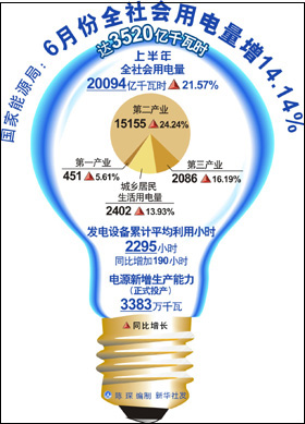 14日,國家能源局發布了6月份以及1至6月份全社會用電量數據。值得關注的是,6月用電量同比增速14.14%,創下今年上半年同比增速新低,其中重工業用電增速環比下降8.89%。業內專家認為,用電量從超高速增長放緩是“理性回歸”,政府宏觀調控手段調整產業結構初見成效。 此外,有部分專家認為近幾個月以來包括PMI在內的眾多指標顯示中國經濟增長速度有放緩的跡象,但受訪多數專家告訴《經濟參考報》記者,中國經濟不會“二次探底”,增幅的逐步減小正好表明了中國經濟逐步趨穩。