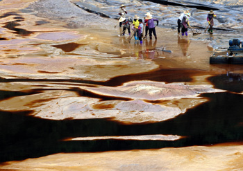 7月13日,工人在清理發生滲漏的紫金礦業銅礦濕法廠污水池內剩余的污水。新華社記者 姜克紅