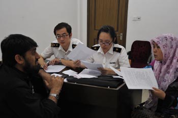 圖為海關關員通過翻譯向販假外商了解其知假販假情況。 |