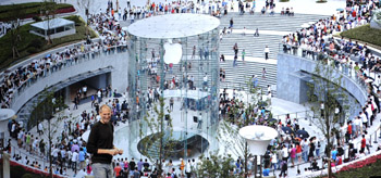 9月1日,在美國(guó)加州舊金山舉行的新產(chǎn)品發(fā)布會(huì)上,蘋果公司首席執(zhí)行官喬布斯(左下)介紹位于中國(guó)上海的蘋果產(chǎn)品零售店。當(dāng)日,蘋果公司發(fā)布新一代iPod、AppleTv等產(chǎn)品。新華社記者 戚恒/攝 |