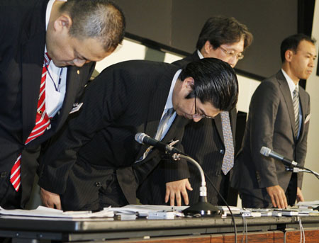 9月28日,日本消費(fèi)信貸公司武富士董事長(zhǎng)吉田純一(左二)和公司管理人員在東京舉行的新聞發(fā)布會(huì)上鞠躬。 當(dāng)日,日本曾經(jīng)的消費(fèi)信貸巨頭武富士公司表示將申請(qǐng)破產(chǎn)保護(hù),其負(fù)債總額已達(dá)51億美元。武富士公司是日本第四大消費(fèi)信貸公司。