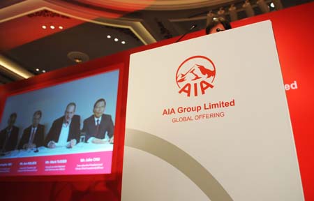 美國國際集團(AIG)旗下的亞洲人壽保險公司友邦保險(AIA)17日在香港宣布啟動首次公開募股。友邦保險計劃發行58.6億股,有望集資高達1153億港元,成為今年以來香港集資額度最大的首次公開募股之一。友邦保險總裁馬克·塔克(屏幕右二)17日在美國通過實時視頻向媒體表示,未來5年亞太區保險產品的市場增長潛力無與倫比。