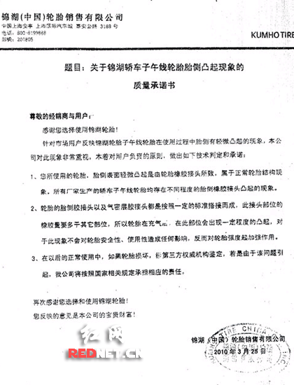 | 廠家錦湖輪胎公司在《質量承諾書》中稱,輪胎輕微凸起屬正常現象 |