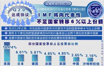 本屆G20財長和央行行長會議就發(fā)展中國家提升在IMF中的地位達成里程碑式協(xié)議。協(xié)議同意歐盟將向發(fā)展中國家轉讓2個席位和6%以上的投票權,IMF董事會目前共有24個席位。該組織執(zhí)行主席卡恩稱此舉為“歷史性”時刻。