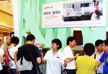 下圖為掛在賣場的杭州奧普電器有限公司廣告。)資料照片 |