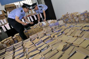 假發票在全國屢禁不止。圖為今年8月,鄭州警方成功打掉一個涉嫌制售假發票的犯罪團伙,搗毀假發票制售存儲窩點7個,收繳假發票32萬余份(包括3萬多份增值稅假發票),假發票可開具的票面金額高達150多億元。新華社發(劉書亭/攝) |