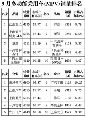 與上月相比,9月銷量排名前十位品牌中,森雅、奧德賽、普利馬分別由上月的三、四、五位下降為四、五、八位;景逸、帥克、菱智新進入前十,風行、開瑞優雅、福建戴姆勒跌出前十;瑞風、別克GL8仍然保持前兩位,閣瑞斯、NV200繼續保持末兩位。