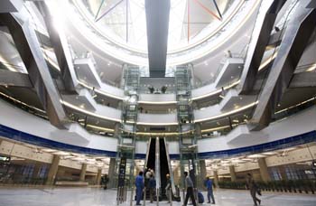 3月12日,施工人員正在對將要投入使用的上海虹橋交通樞紐的內部設施進行調試。記者 裴鑫/攝 |
