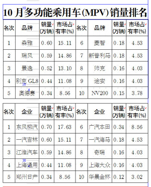 10月銷量排名前10位的MPV品牌共銷售3.32萬(wàn)輛,占MPV車總銷量的83.6%。